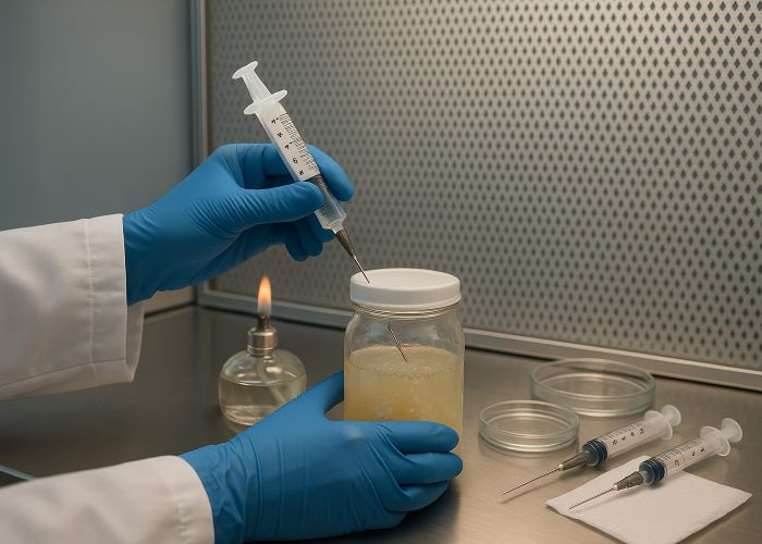 Все действия с открытием банок, шприцов, игл — только в стерильной зоне. Если нет бокса, используйте спиртовку или газовую горелку, чтобы создать восходящий поток, отсекающий споры из воздуха. Без этого вы работаете вслепую.